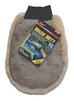 Double-faced mitt carries an abundance of soap and water. Genuine sheepswool with the added feature of nylon mesh on one side for extra cleaning performance in removing "bug glub", bird droppings and algae. Natural wool side for washing, cleaning and polishing. Features heavy-duty cuff with leather loop for hanging. Attractively packaged.